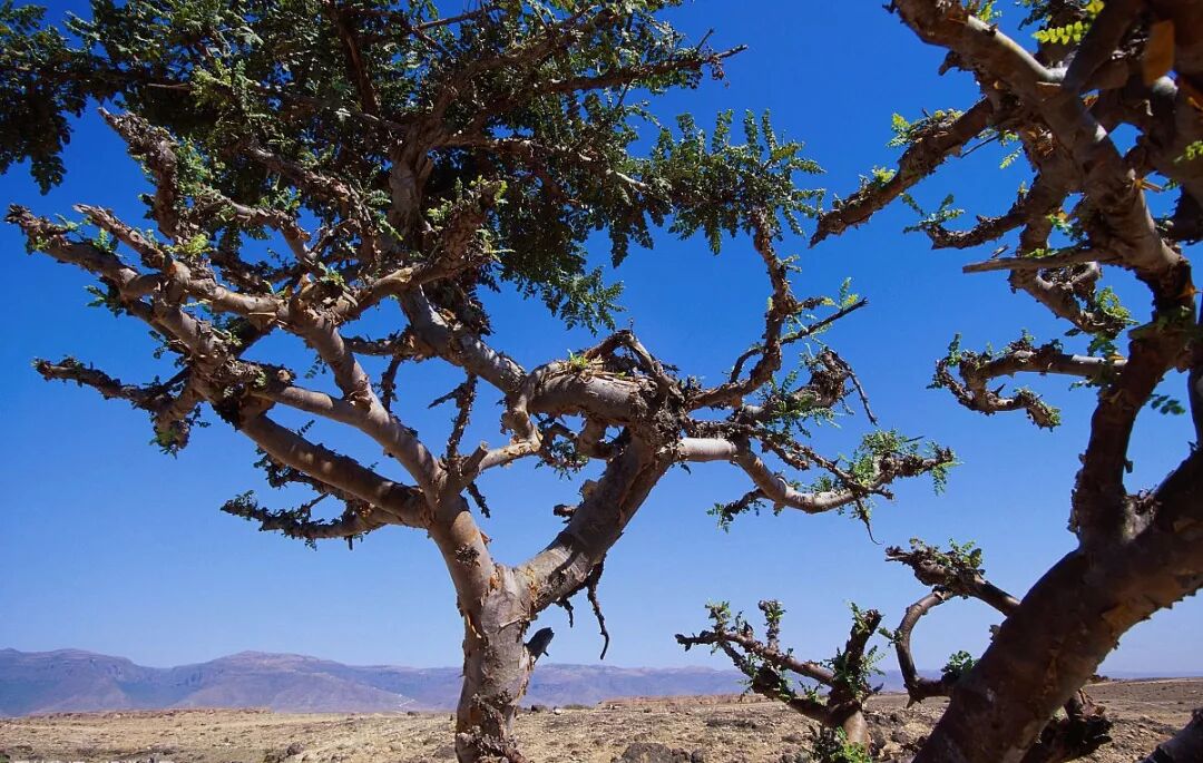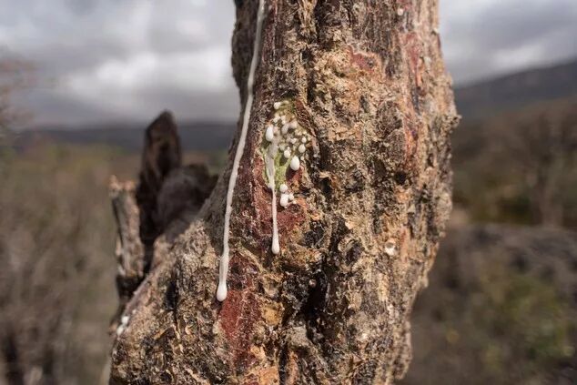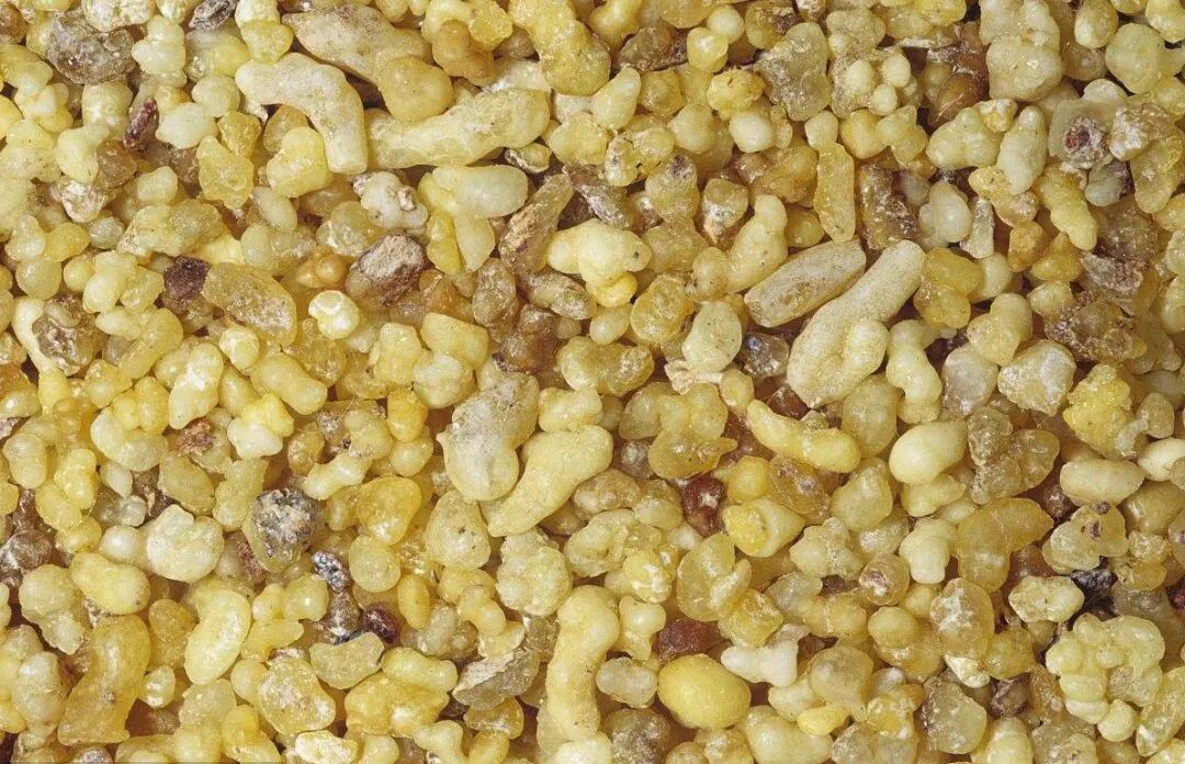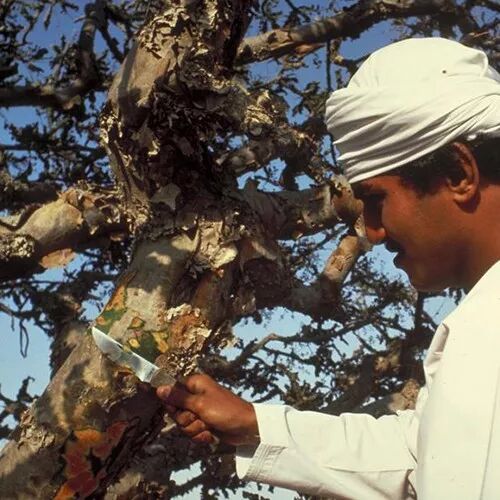 乳香类似于“松脂”,为树上自然分泌液体凝结后的颗粒。每年4-6月,是乳香收获的季节,当地人会使用一种刀状工具,轻轻刮去乳香树外层的灰色树皮,这样在切口处便会渗出一滴滴白色的树脂,如“乳汁”一般,故有“乳香”之名,待数周后渗出的树脂凝固成半透明的颗粒,就可以将它刮取下来,刮取后的切口又会分泌出新的树脂。